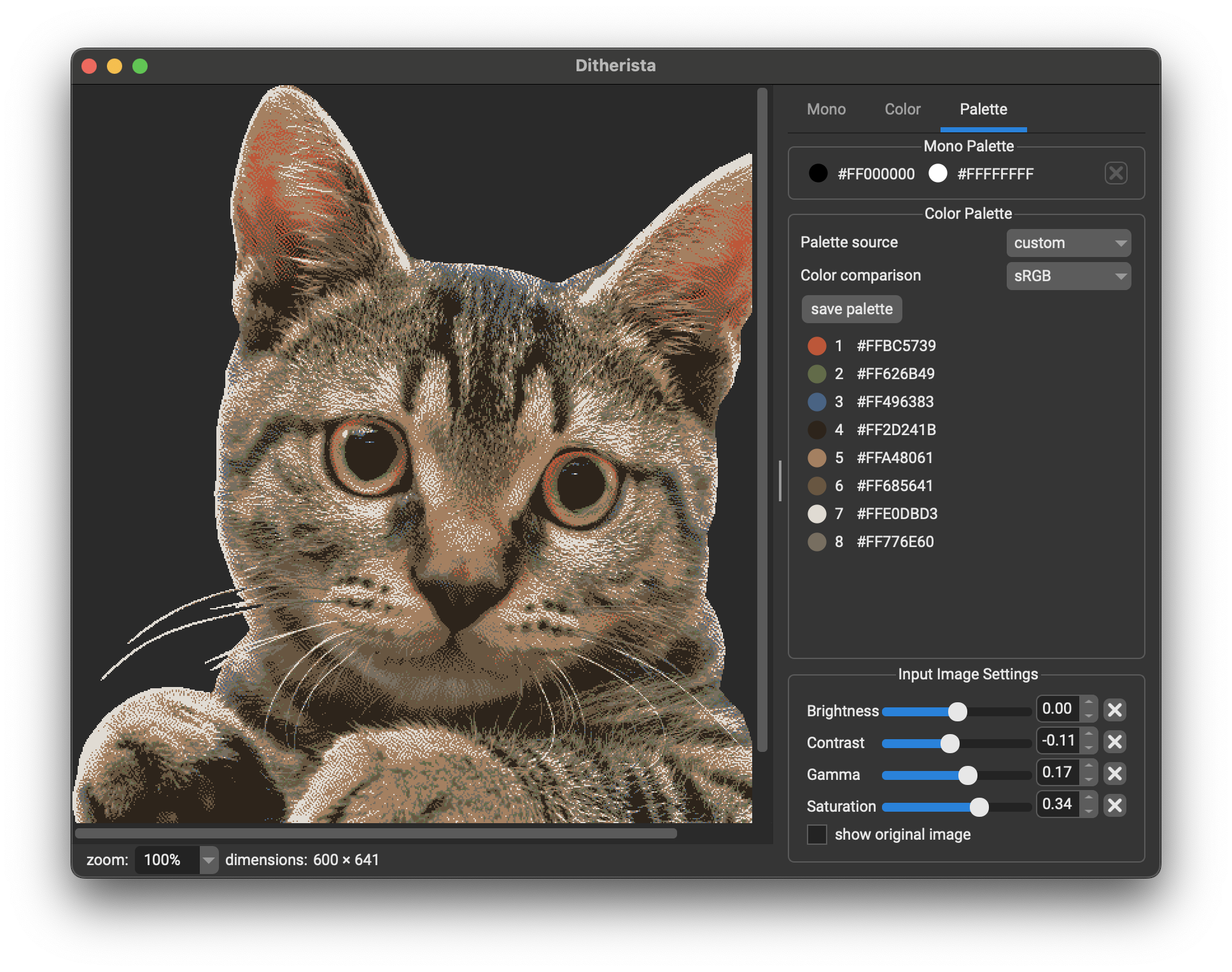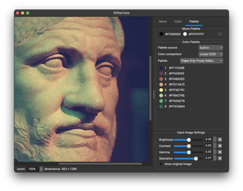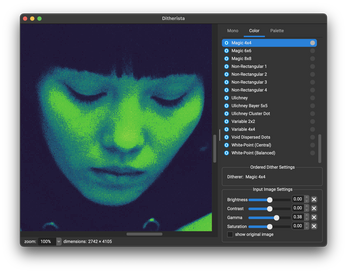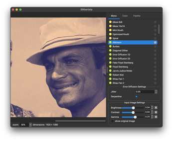 There is a thing, that I really don't like is that the software defaults to given method and color. Actually to mono and the very first method. When switchhing to color-methods, it is also defaults to given palette; Macintosh(16) sRGB. That would be nice if the program can remember the last used method. Also adding a 'settings' menu and the possibility to select what should be the default. Like different dithering method, mono or colored, and also which palette or any setting to use by default.