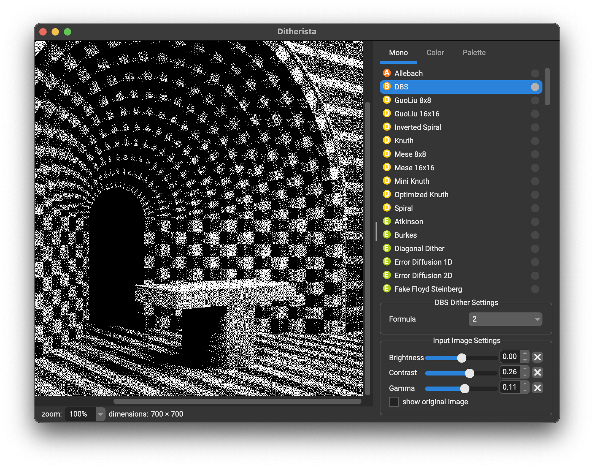 Ditherista is a small Windows, Linux and macOS GUI application for creating color and black-and-white dithered images. It features easy import and export and over 90 different dithering methods.